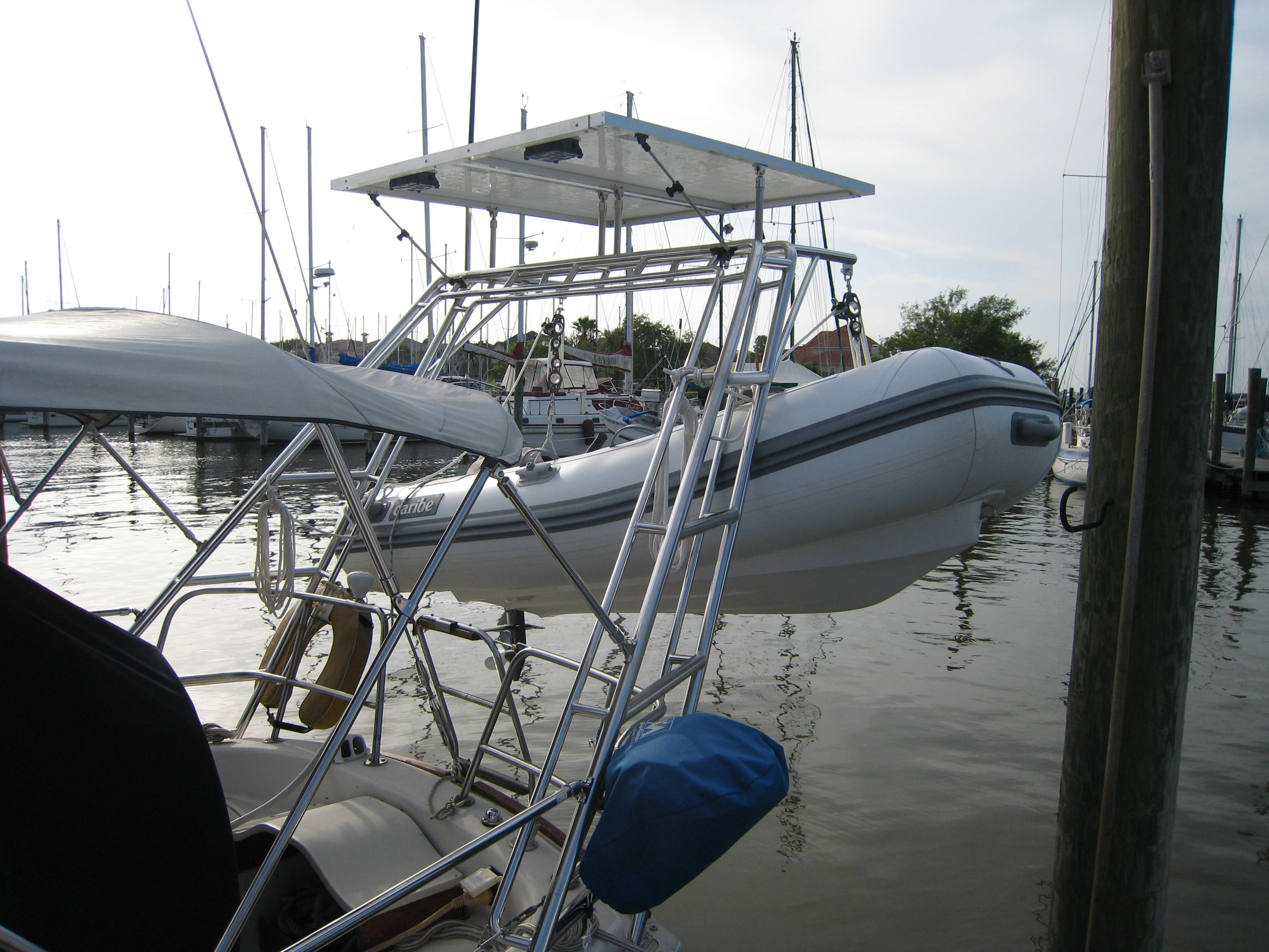 Bob, my welder, and I created this dinghy davit system. It holds the dinghy plus the motor, solar panels, vhf antenna, and soon a radar dome. Im not a welder, but I spent at least 40 hours with him in his shop putting this monster together. |