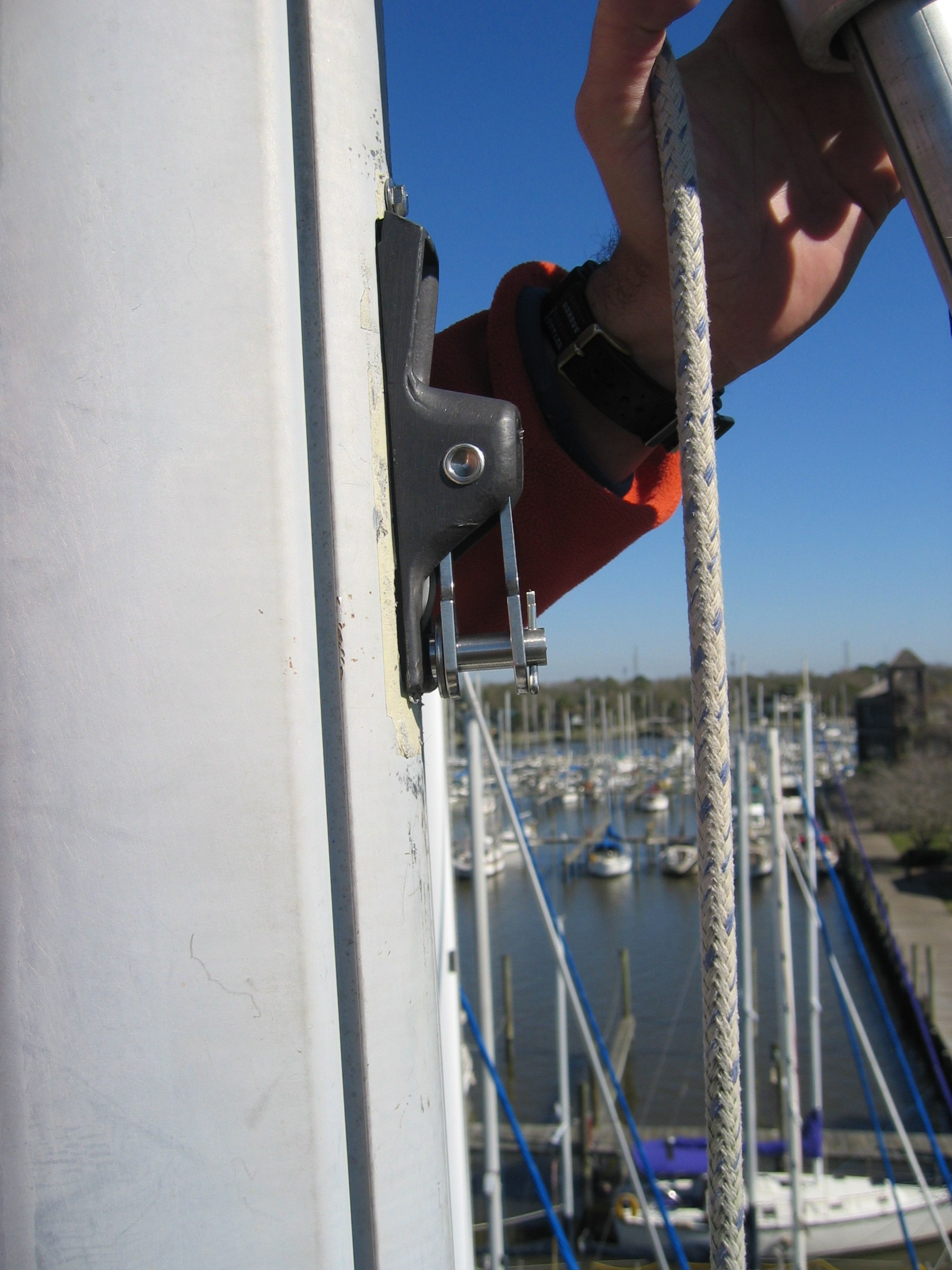 Inner Forestay tang and block for the hailyard. This is a removable solent stay that will be attached during higher winds for hank on jibs. |